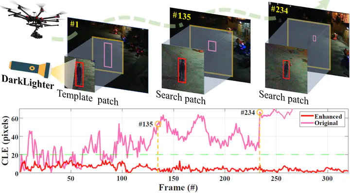 Recent years have witnessed the fast evolution and promising performance of the convolutional neural network (CNN)-based trackers, which aim at imitating biological visual systems. However, current CNN-based trackers can hardly generalize well to low-light scenes that are commonly lacked in the existing training set. In indistinguishable night scenarios frequently encountered in unmanned aerial vehicle (UAV) tracking-based applications, the robustness of the state-of-the-art (SOTA) trackers drops significantly. To facilitate aerial tracking in the dark through a general fashion, this work proposes a low-light image enhancer namely DarkLighter, which dedicates to alleviate the impact of poor illumination and noise iteratively. A lightweight map estimation network, \textit{i.e.}, ME-Net, is trained to efficiently estimate illumination maps and noise maps jointly. Experiments are conducted with several SOTA trackers on numerous UAV dark tracking scenes. Exhaustive evaluations demonstrate the reliability and universality of DarkLighter, with high efficiency. Moreover, DarkLighter has further been implemented on a typical UAV system. Real-world tests at night scenes have verified its practicability and dependability.