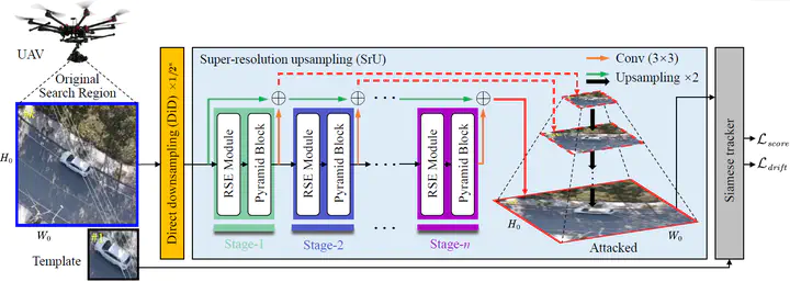 Visual tracking is adopted to extensive unmanned aerial vehicle (UAV)-related applications, which leads to a highly demanding requirement on the robustness of UAV trackers. However, adding imperceptible perturbations can easily fool the tracker and cause tracking failures. This risk is often overlooked and rarely researched at present. Therefore, to help increase awareness of the potential risk and the robustness of UAV tracking, this work proposes a novel adaptive adversarial attack approach, i.e., Ad2Attack, against UAV object tracking. Specifically, adversarial examples are generated online during the resampling of the search patch image, which leads trackers to lose the target in the following frames. Ad2Attack is composed of a direct downsampling module and a super-resolution upsampling module with adaptive stages. A novel optimization function is proposed for balancing the imperceptibility and efficiency of the attack. Comprehensive experiments on several well-known benchmarks and real-world conditions show the effectiveness of our attack method, which dramatically reduces the performance of the most advanced Siamese trackers.