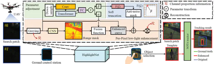 Low-light environments have posed a formidable challenge for robust UAV tracking even with state-of-the-art trackers since the potential image features are hard to extract under adverse light conditions. Besides, due to the low visibility, accurate online selection of the object also becomes extremely difficult for human monitors to initialize UAV tracking in ground control stations (GCSs). To address these problems, this work proposed a novel enhancer, i.e., HighlightNet, to light up potential objects for both human operators and UAV trackers. By employing Transformer, HighlightNet can adjust enhancement parameters according to global features and is thus adaptive for illumination variation. Pixel-level range mask is introduced to make HighlightNet more focused on the enhancement of the tracking object and regions without light sources. Furthermore, a soft truncation mechanism is built to prevent background noise from being mistaken for crucial features. Experiments on image enhancement benchmarks demonstrate HighlightNet has advantages in facilitating human perception. Evaluations on the public UAVDark135 benchmark show that HightlightNet is more suitable for UAV tracking tasks than other top-ranked low-light enhancers. In addition, with real-world tests on a typical UAV platform, HighlightNet verifies its practicability and efficiency in nighttime aerial tracking-related applications. The code and demo videos are available at https://github.com/vision4robotics/HighlightNet.