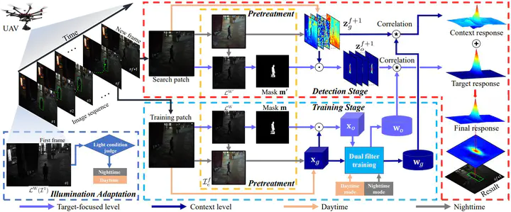Unmanned aerial vehicle (UAV) has facilitated a wide range of real-world applications and attracted extensive research in the mobile computing field. Specially, developing real-time robust visual onboard trackers for all-day aerial maneuver can remarkably broaden the scope of intelligent deployment of UAV. However, prior tracking methods have merely focused on robust tracking in the well-illuminated scenes, while ignoring trackers’ capabilities to be deployed in the dark. In darkness, the conditions can be more complex and harsh, easily posing inferior robust tracking or even tracking failure. To this end, this work proposes a novel discriminative correlation filter-based tracker with illumination adaptive and anti-dark capability, namely ADTrack. ADTrack firstly exploits image illuminance information to enable adaptability of the model to the given light condition. Then, by virtue of an efficient enhancer, ADTrack carries out image pretreatment where a target aware mask is generated. Benefiting from the mask, ADTrack aims to solve a novel dual regression problem where dual filters are online trained with mutual constraint. Besides, this work also constructs a UAV nighttime tracking benchmark UAVDark135. Exhaustive experiments on authoritative benchmarks and onboard tests are implemented to validate the superiority and robustness of ADTrack in all-day conditions.